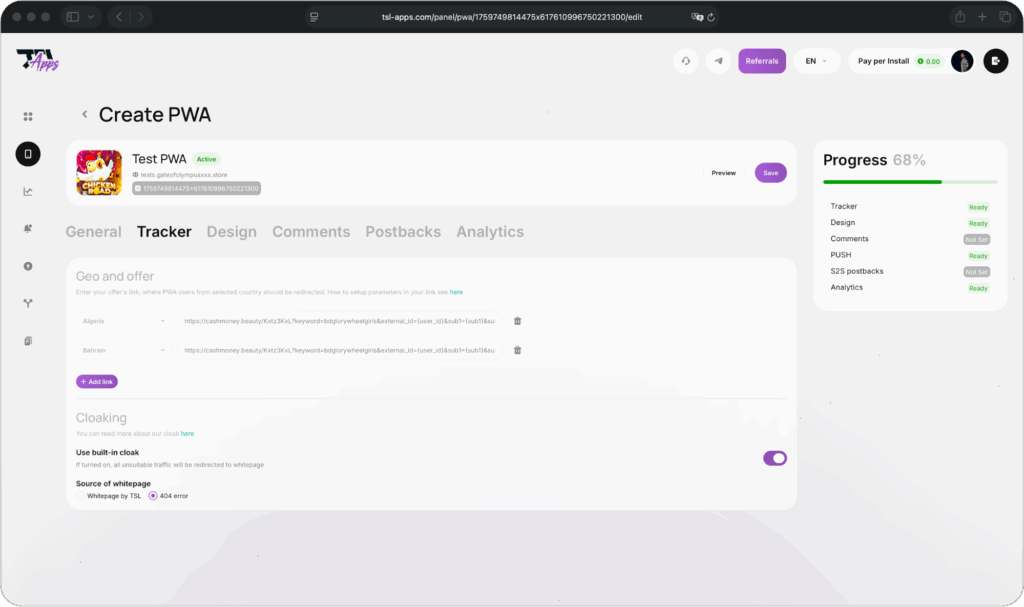 В разделе «Tracker» внутри PWA можно настроить линки сразу на несколько ГЕО.