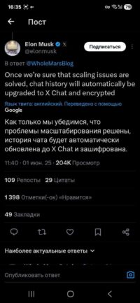 В посте от 1 июня 2025 года Илон Маск анонсировал XChat — мессенджер с end-to-end шифрованием и исчезающими сообщениями, возможностью отправлять любые типы файлов через платформу.