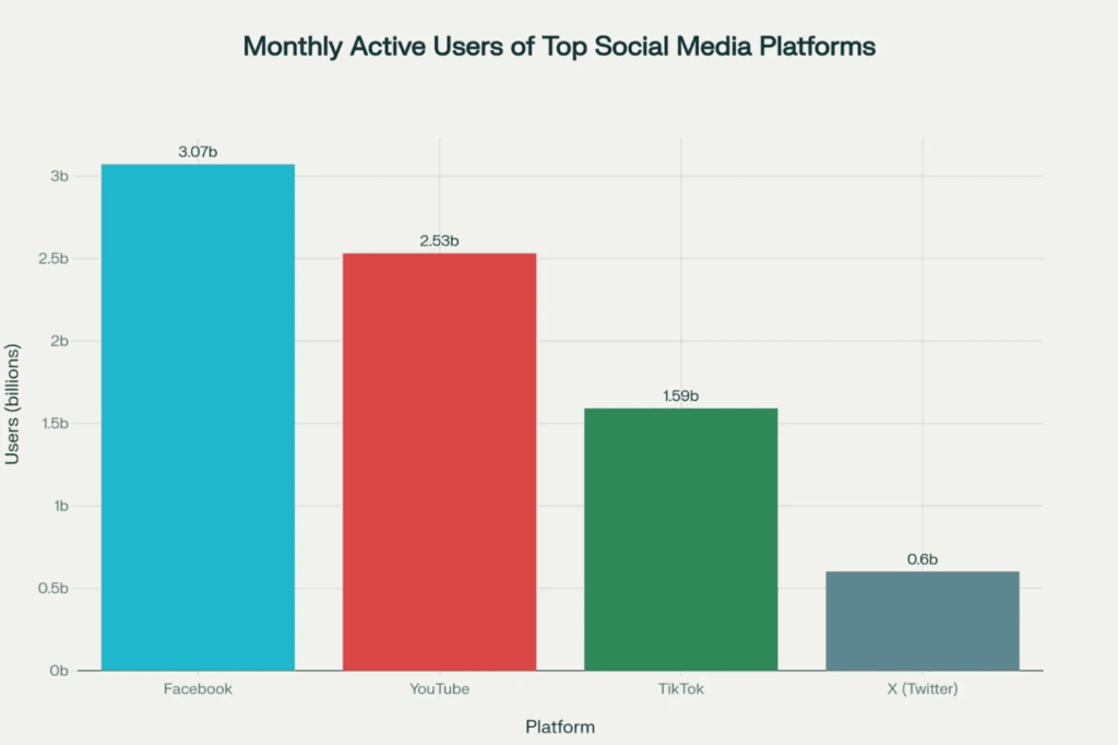 Еще раз сравним X с топами — соцсеть уступает Facebook*, YouTube и TikTok по количеству пользователей