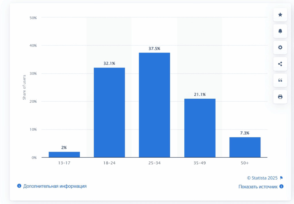 Меньше всего пользователей из Африки, на которую приходится около 5% от общей пользовательской базы. В России это также не самая популярная соцсеть — в 2025 году аудитория составляет примерно 628,6 тысяч человек.
