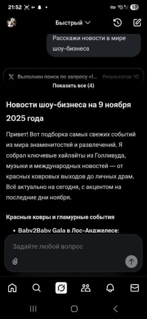 В X есть отдельный раздел Grok AI, где пользователи могут задавать вопросы боту, генерировать текст и изображения, редактировать картинки. Нейросеть может обрабатывать посты на платформе X в режиме реального времени. Например, если попросить поделиться новостями из сферы шоу-бизнеса, Grok сгенерирует контент, опираясь на твиты звезд.