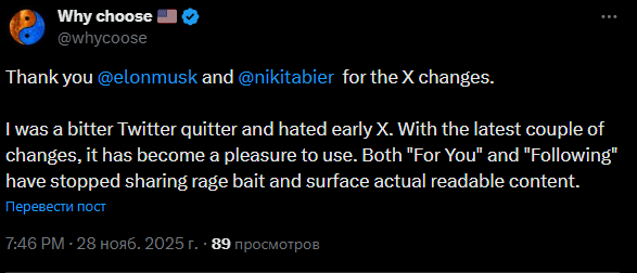 «На основе анализа постов в X (октябрь–ноябрь 2025), пользователи в целом положительно настроены, особенно креаторы и фанаты платформы, но есть и скептики.
