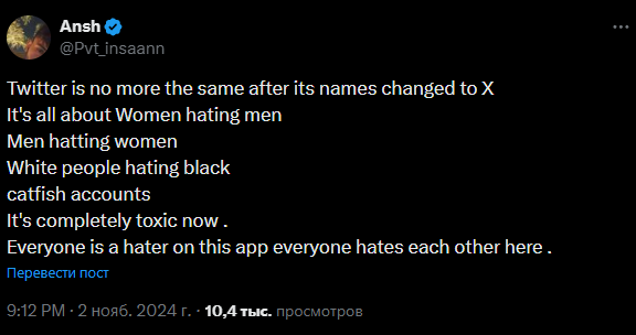 Но Х критикуют за распространение дезинформации. В последние годы восприятие платформы X стало еще более неоднозначным, так как теперь аккаунт с синей галочкой можно просто купить. Если раньше синяя галочка была знаком качества, то теперь она стала признаком того, что пользователь оплатил подписку. Это снизило уровень доверия пользователей социальной сети.