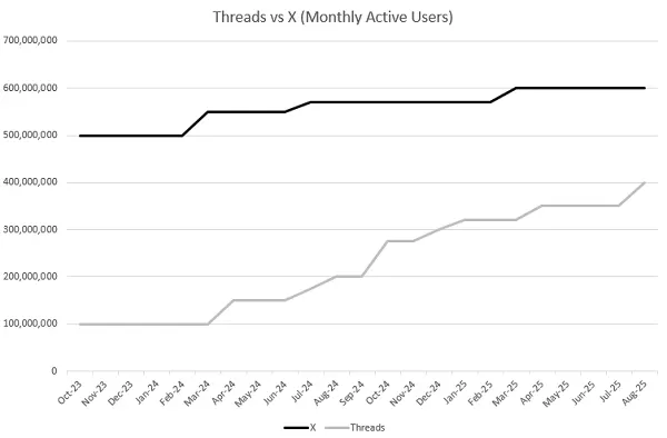На октябрь 2025 года у Threads 400 миллионов пользователей в месяц, а у X — 600, но разрыв быстро сокращается: