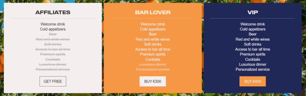 | Free Pass (для аффилиатов) | - | приветственный напиток, легкие закуски |