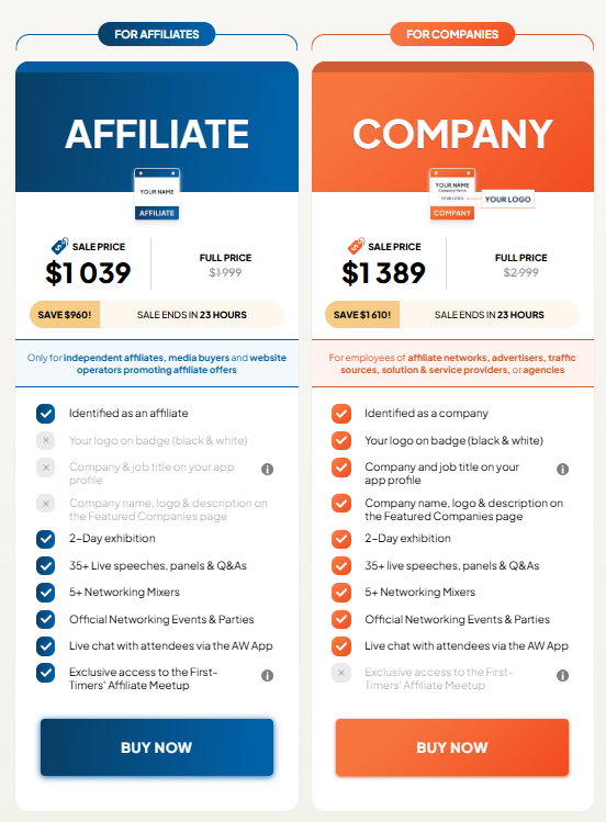 Купить билет на Affiliate World Dubai можно на сайте конференции. Организаторы предлагают две категории билетов: