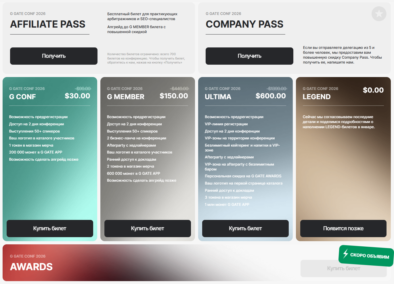 Купить билет на G GATE CONF 2026 можно на сайте конференции. Базовый билет Affiliate Pass для практикующих арбитражников и SEO-специалистов бесплатный: заранее свяжитесь с организаторами в Telegram.