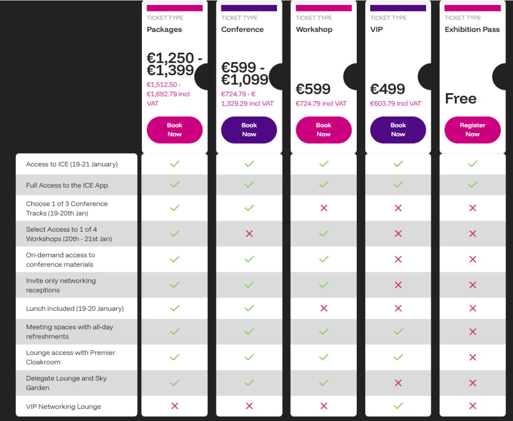 Вход на выставку ICE Barcelona 2026 без доступа к конференциям и воркшопам бесплатный, требуется только предварительная регистрация на сайте. За €603.79 можно купить VIP-билет, чтобы получить доступ в переговорные комнаты, VIP Lounge зоны.