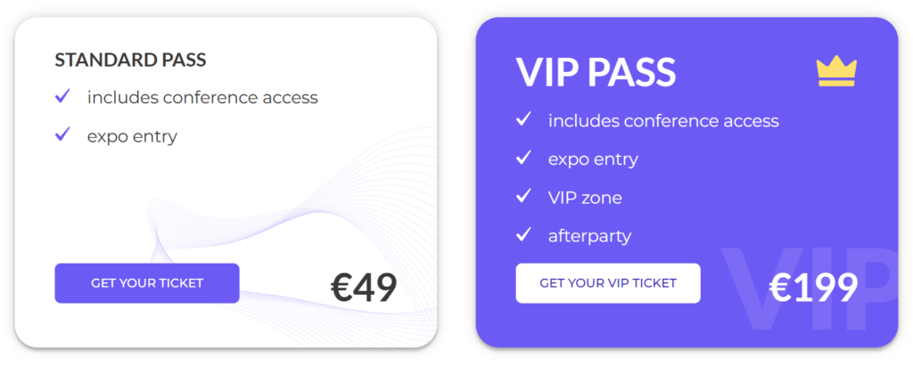 | VIP Pass | Участие в конференции, доступ в VIP-зону и вход на вечеринку | €199 |