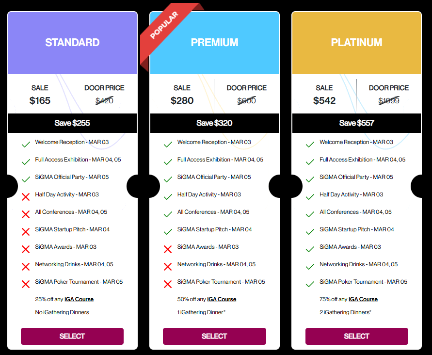 | Platinum | Полный VIP-доступ ко всем мероприятиям саммита, включая: церемонию SiGMA Awards, все нетворкинг-ужины, вечеринку SiGMA Official Celebration. | $542 | $1099 |