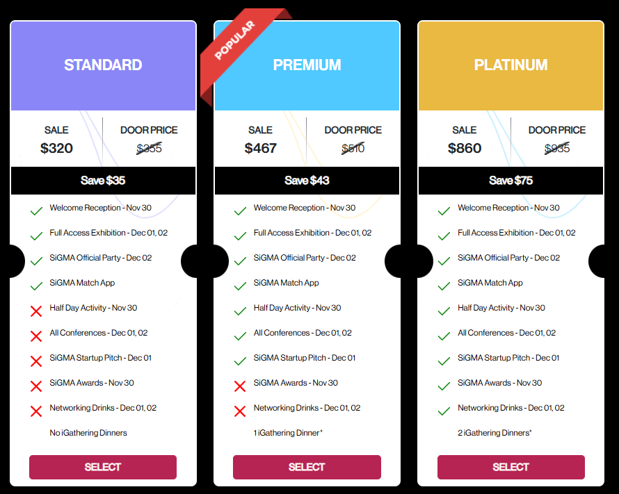 Билет на SiGMA South Asia можно купить на сайте саммита. Организаторы предлагают несколько категорий с различным уровнем доступа.