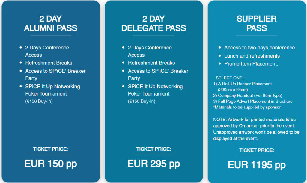 Билет участника (Delegate Pass) стоит €295 и включает все доклады, ланч и вход на вечеринку, отдельно оплачивается только buy-in для игры в покер. Для участников других конференций из серии SPiCE билет Alumni Pass со скидкой стоит €150.