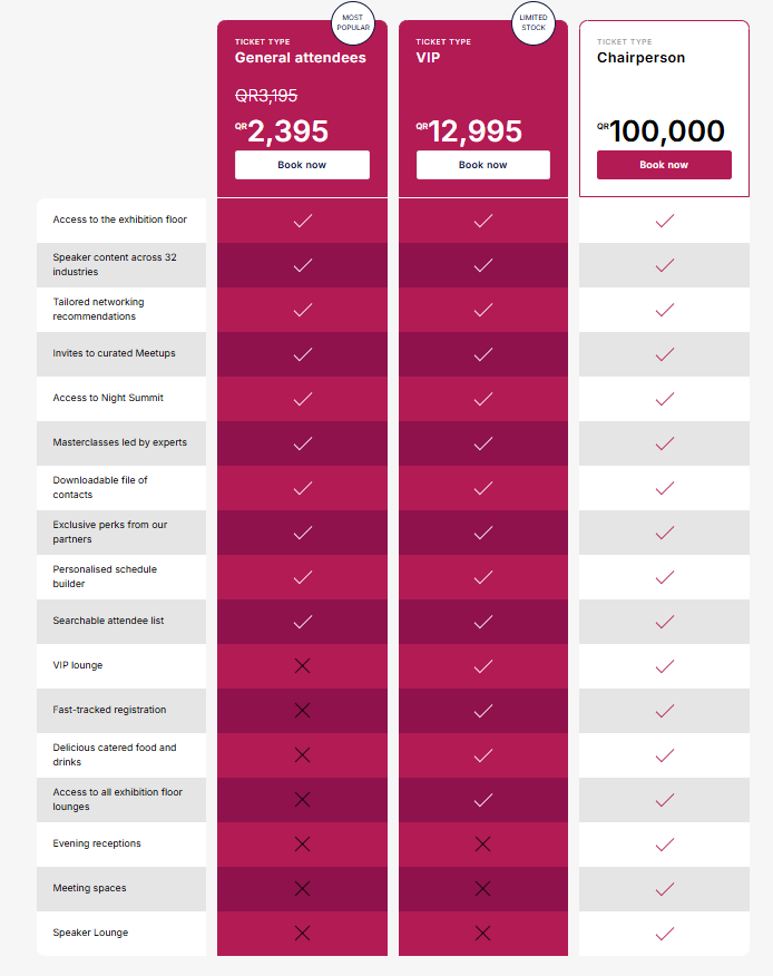 Билеты на Web Summit Qatar 2026 можно купить на сайте конференции. Доступны три категории билетов с разным уровнем доступа и привилегий.