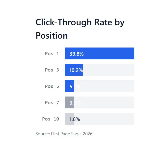Практический вес этого: позиция 1 забирает 39.8% кликов, позиция 5 — 5.1%, позиция 7 — 3.0%; падение с 5-й на 7-ю уничтожает 41% органического трафика.