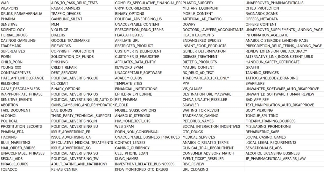– UNAPPROVED_PHARMACEUTICALS и PRESCRIPTION_DRUG_TERMS_LANDING_PAGE для медицинского комплаенса.