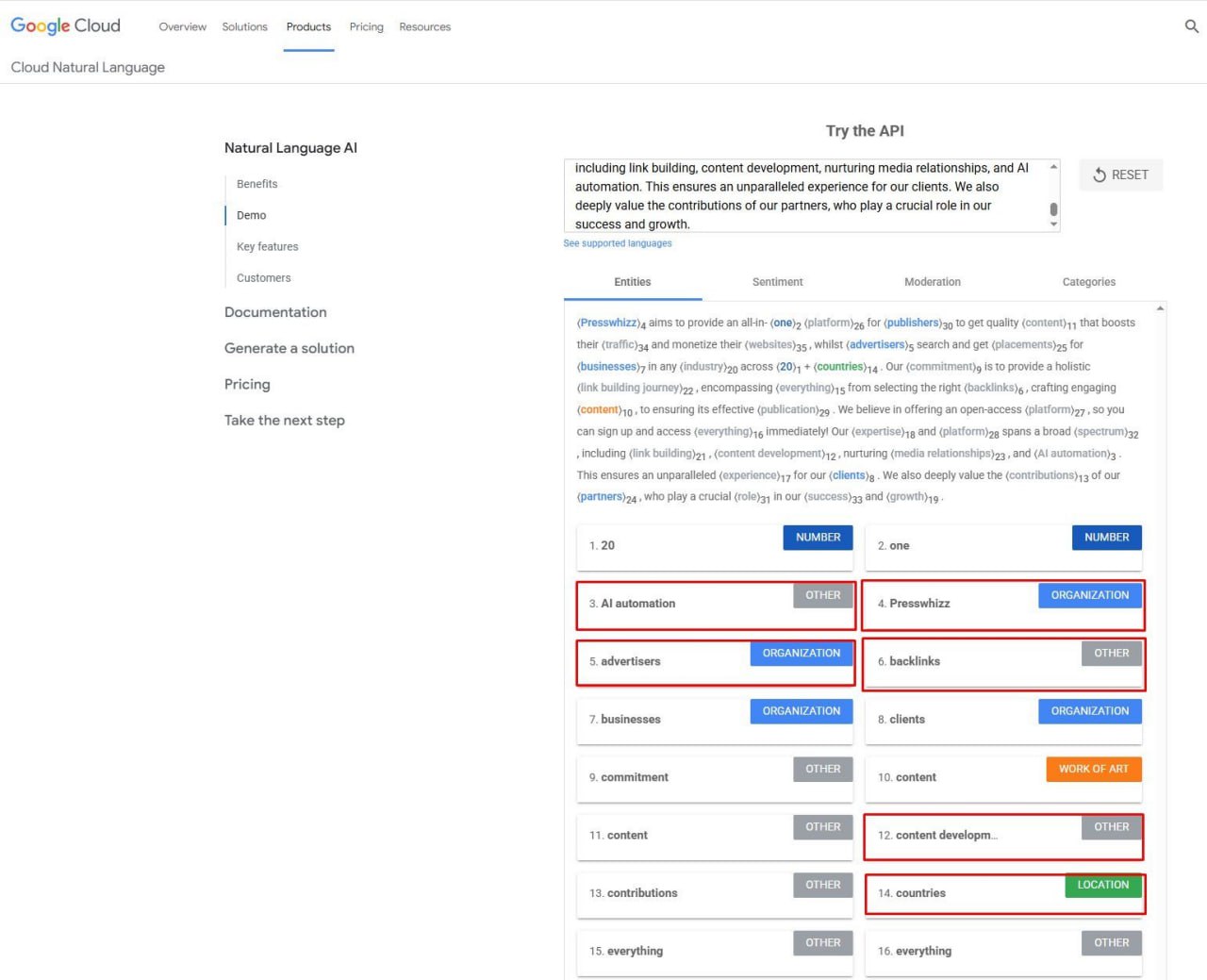 Зайдите на https://cloud.google.com/natural-language, проскролльте до блока «Try the API«, вставьте контент страницы и нажмите «Analyze«.