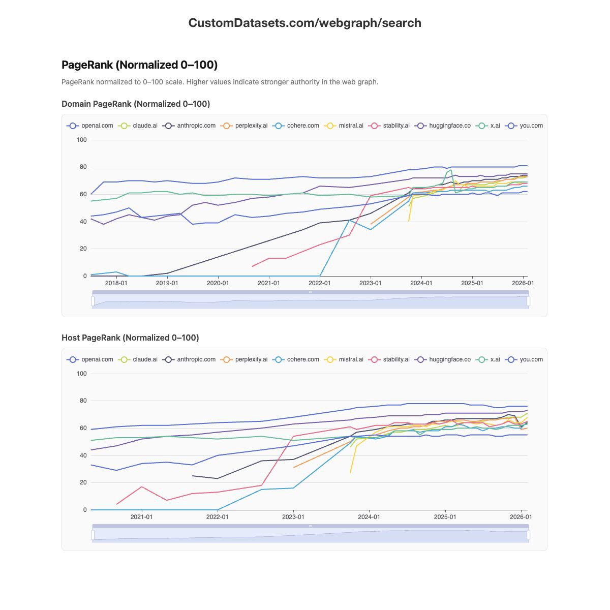 Шкала 0-100 делает PageRank и Harmonic Centrality мгновенно применимыми и понятными.